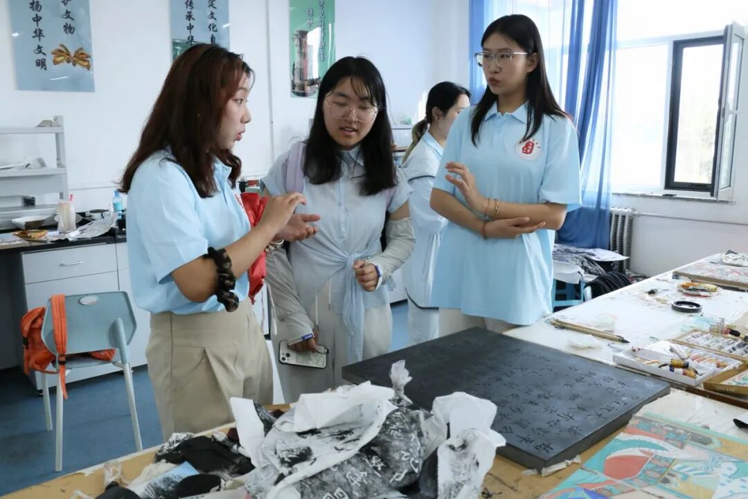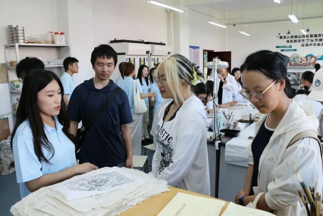 参观云冈文化陈列馆后,同学们回到文德楼实验室,我院文物保护技术专业学子向清华大学实践团队的同学们介绍了拓印、文物修复、壁画修复与绘制等技术,同学们深入体验文物保护技术专业技能,感受古代壁画艺术的魅力与精髓,也深刻理解文物修复对于传承历史文化的重要性。