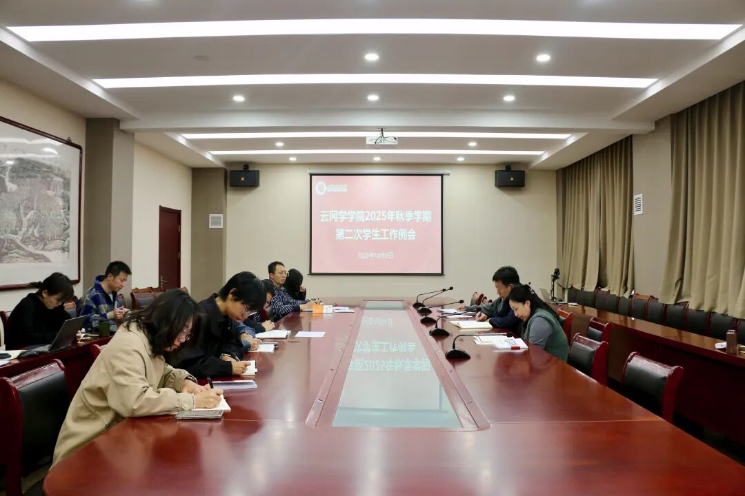 2025年10月9日下午,云冈学学院在文德楼四层会议室召开2025年秋季学期第二次学生工作例会。学院党委书记解廷月,党委副书记杨娜,全体专、兼职辅导员参加会议,会议由院团委副书记、学工部副主任唐君慧主持。