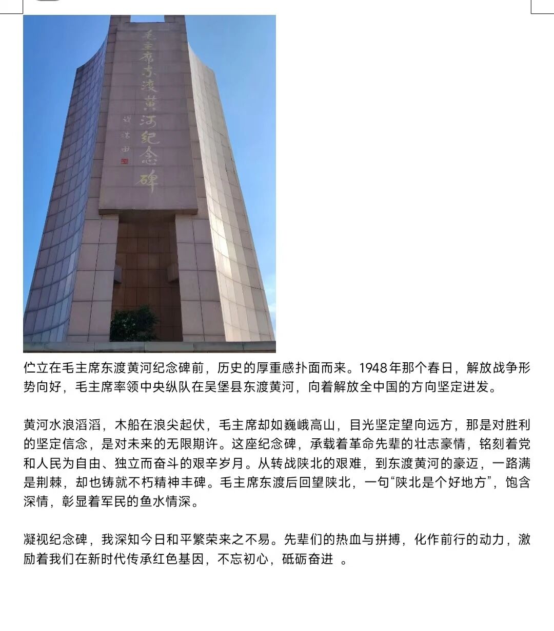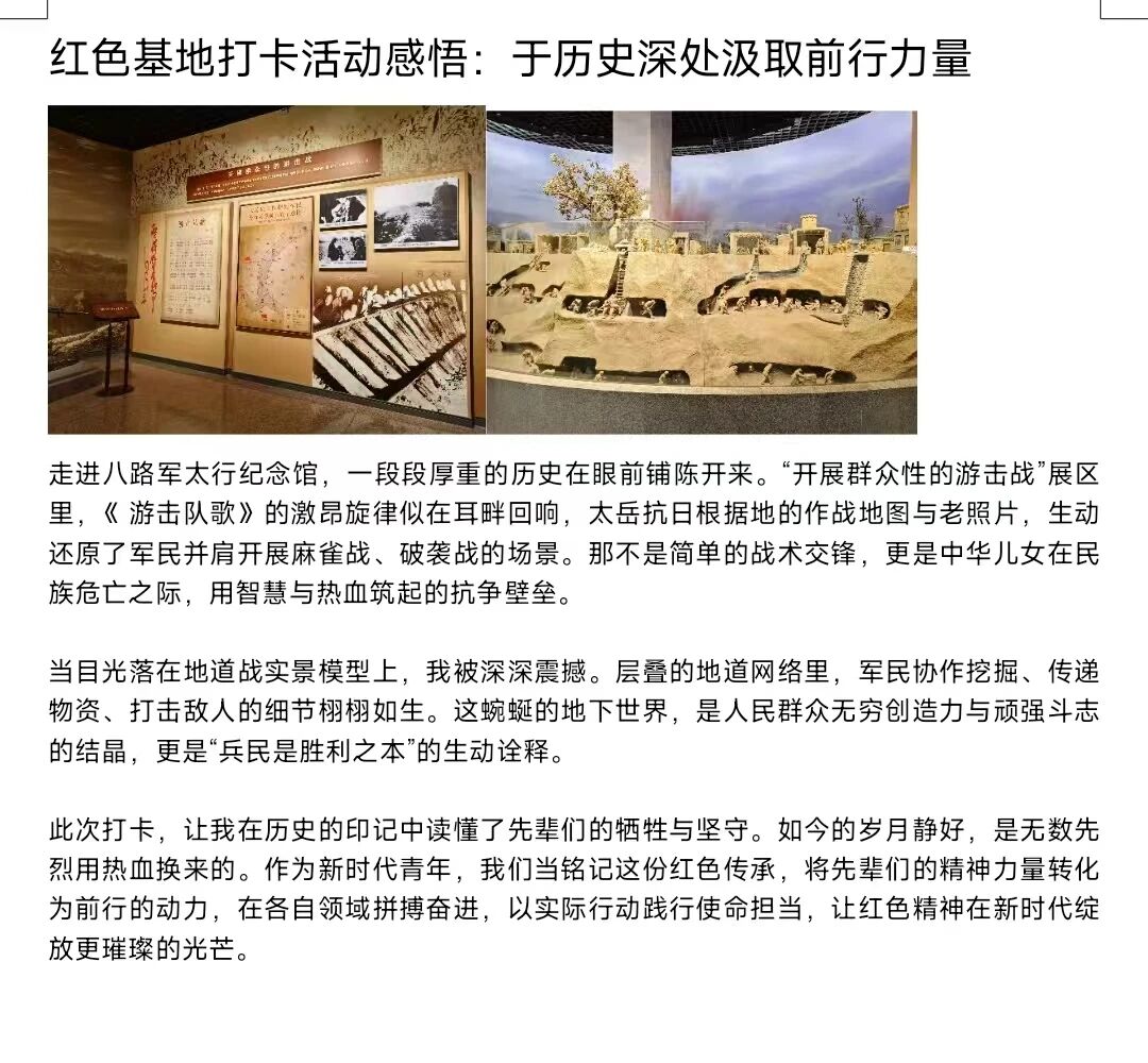 忆九一八铭历史痛,以足迹寻英雄魂。红色打卡活动中,同学们以脚步丈量红色土地,以心声传递信仰力量。2024级旅游管理一班练瑞瑞的作品文图互映,回溯1948年毛主席东渡黄河、奔赴解放全国的征程,纪念碑照片庄严肃穆,既显和平珍贵,更让红色传承使命扎根。她走进八路军太行纪念馆,透过展区文图(作战地图、老照片等)回望军民抗敌的峥嵘岁月,读懂先辈坚守,让红色传承的使命深深扎根心底。
